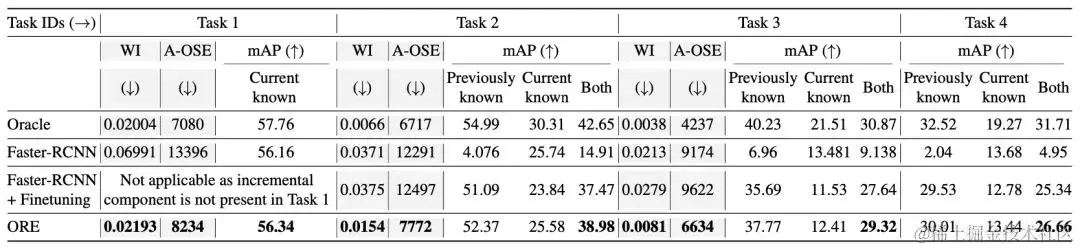 下表展示了ORE在开放世界目标检测中的表现。WI和A-OSE量化评估了ORE如何处理未知类(灰色背景),而mAP衡量了它如何很好地检测已知类(白色背景)。可以看到在所有指标上,ORE都始终优于基于Faster R-CNN的baseline。