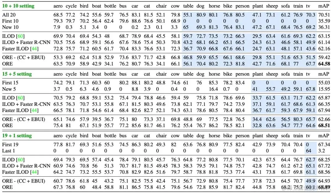 同时,作者在三种不同的设置下将ORE与最新的增量式目标检测器进行了比较。如下表所示,ORE在所有设置中都表现十分出色。