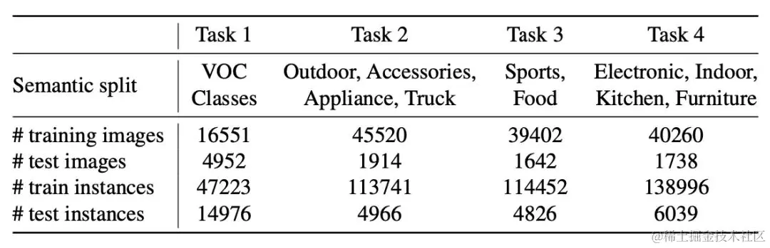 作者提出了一项全面的评估标准来探讨开放世界的目标检测器的性能,包含对未知对象的识别,检测已知类别,以及对未知物提供以标签时逐渐学习新类别。下表显示了开放世界评估标准中的任务组成: