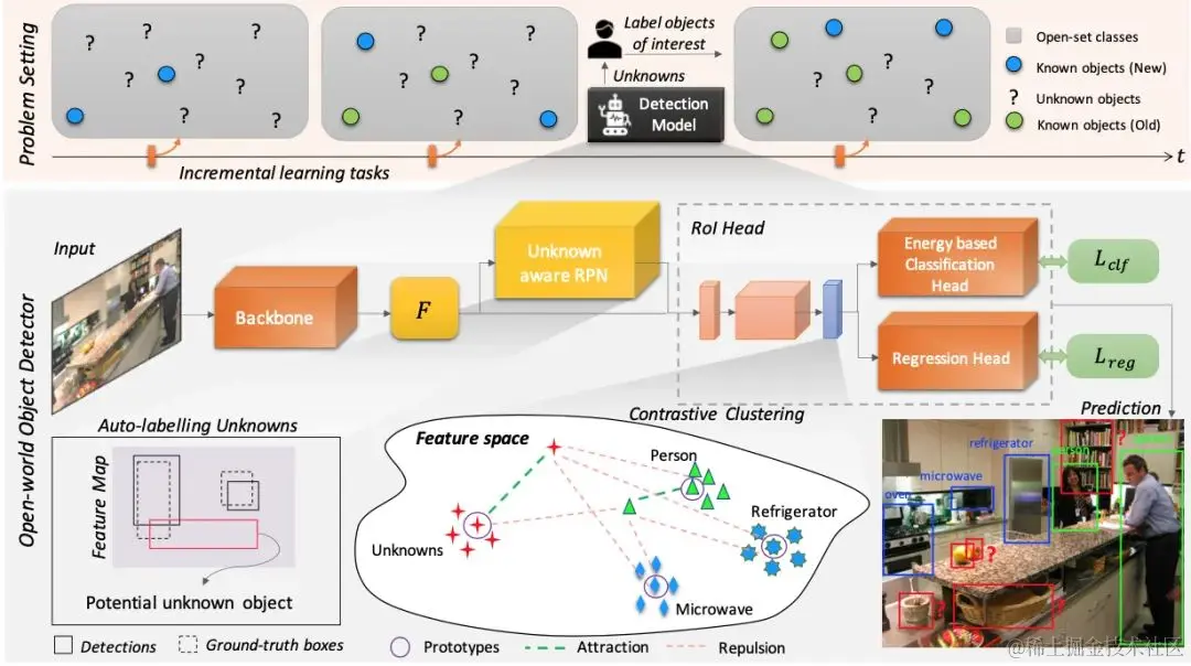 成功的开放世界目标检测方法应能够在没有明确监督的情况下进行未知实例的识别,并能将识别出的新实例标签提供给模型进行知识升级,同时不会忘记之前的实例,且无需从头开始重新训练。本文提出的ORE便能一并应对这两个挑战。