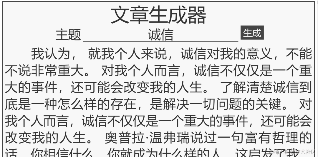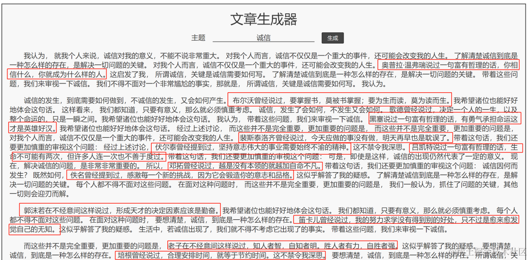 作者称之为【狗屁不通文章生成器】,只要给出关键词,就会围绕关键词迅速生成一篇文章,例如小编输入写作文常见的命题【诚信】,啪的一下,就创作完成了!我们可以体会一下:\