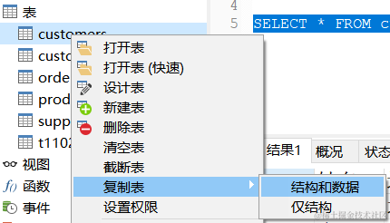 选中customers表,然后右键选择【复制】-【数据和结构】,如下图: