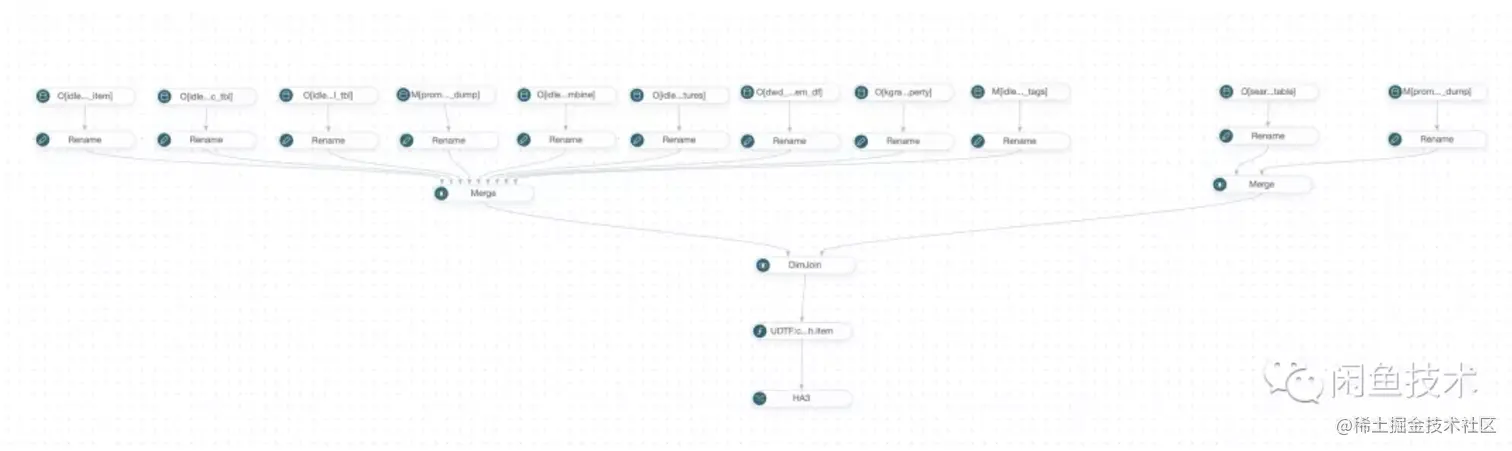 蓝色部分表示HA3在线服务,提供在线召回商品服务;绿色部分表示引擎数据源聚合(离线dump)逻辑,将商品信息构建成对应的引擎数据源。下图为一个离线引擎dump的数据源图示例: