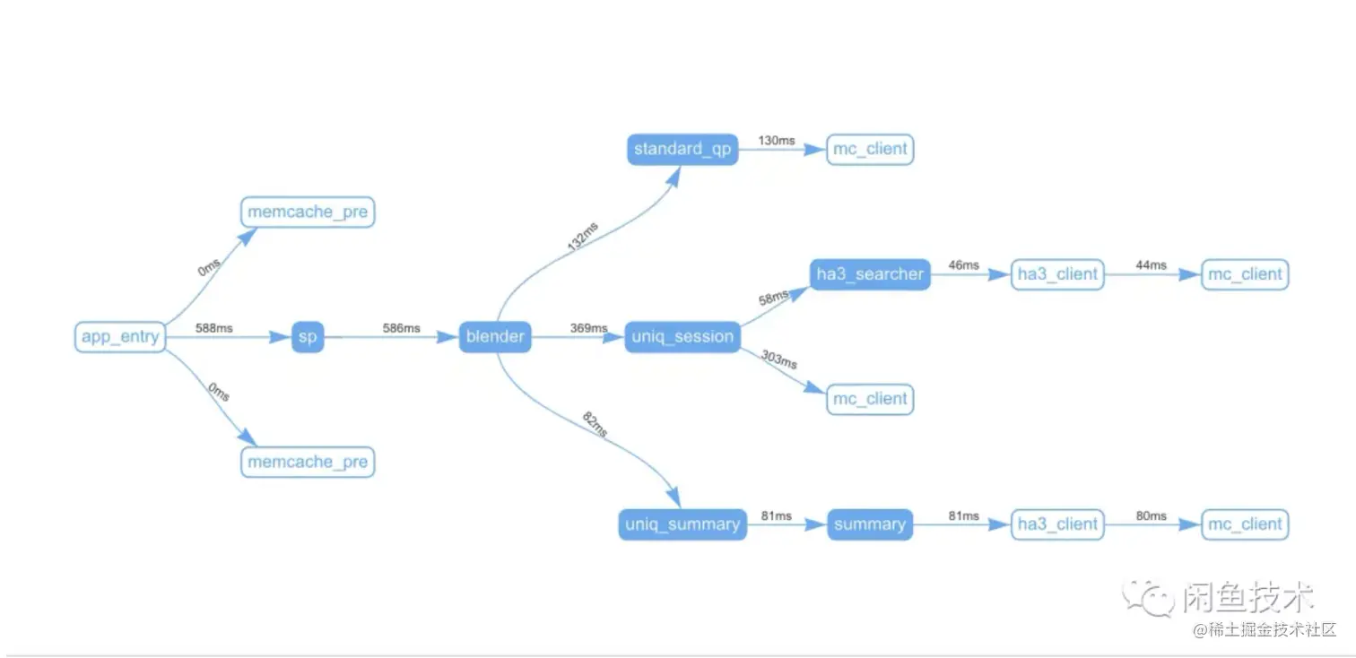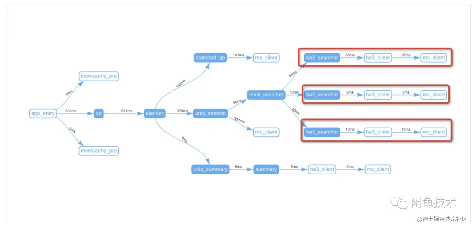 红框中每一个ha3_searcher表示一条独立引擎召回链路,图中三条链路可得出当前召回是多路并发召回(56ms < 54ms + 10ms +20ms)。