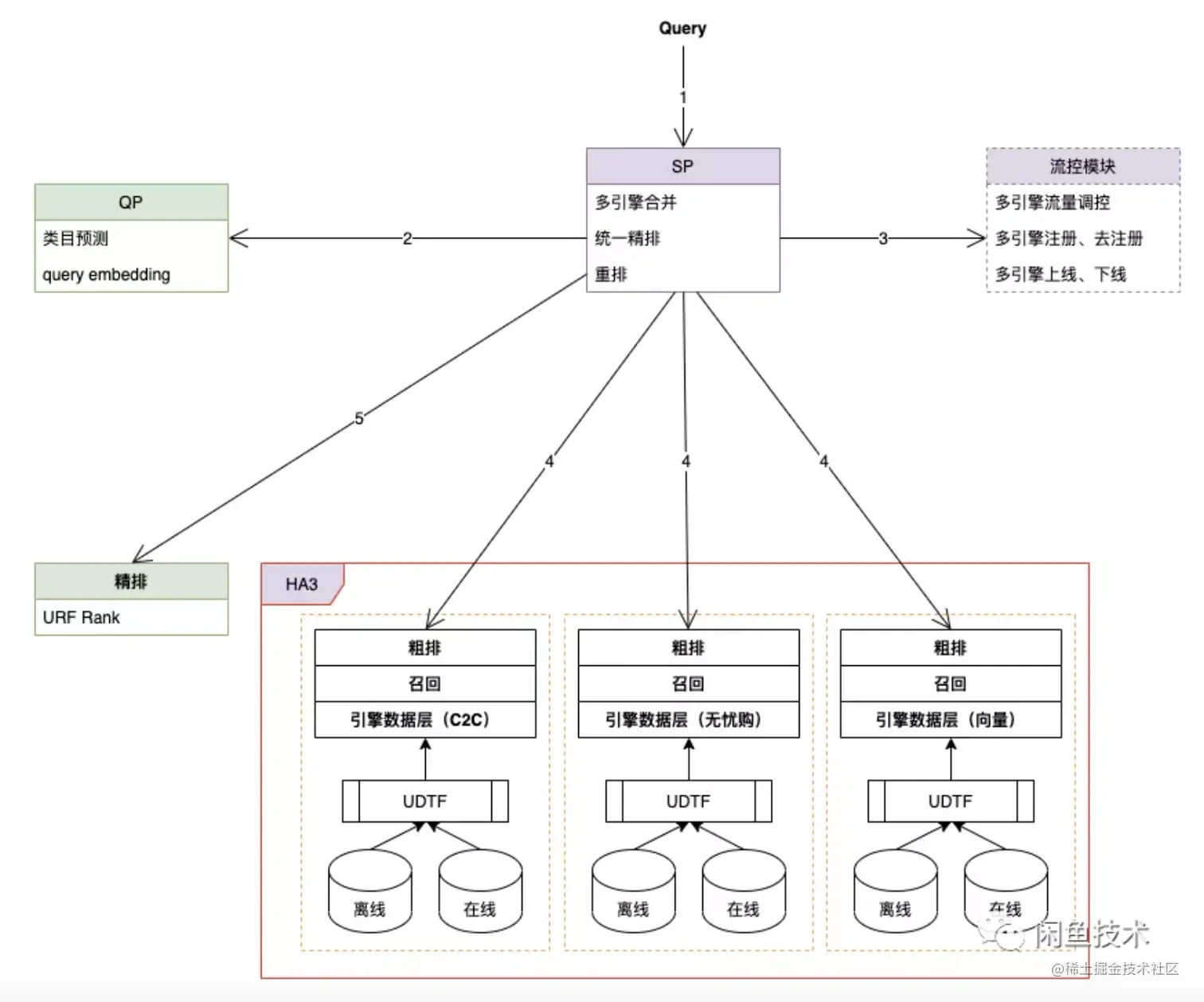 3、步骤4依据query中携带的多引擎标识,并发请求不同引擎在线服务召回商品,并合并召回结果,统一调用步骤5的精排服务能力