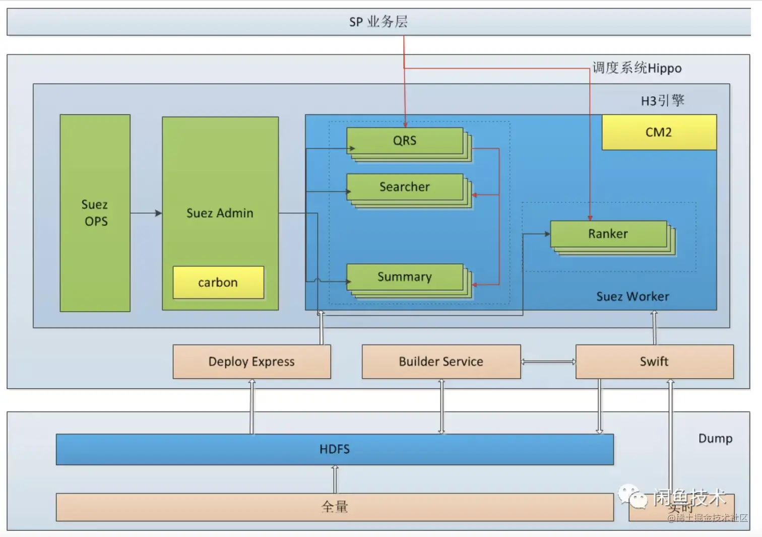 闲鱼搜索很多场景基于集团搜索中台能力,搜索引擎分为数据源聚合(离线dump)、全量/增量/实时索引构建及在线服务等部分,通过集团内部一系列处理阶段,对客户提供高可用高性能的搜索服务。服务架构如下: