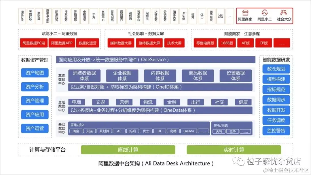 3、把数据抽取到计算平台,通过以“业务板块 + 业务过程 + 分析维度”为架构去构建“数据共享中心”,构建OneData体系