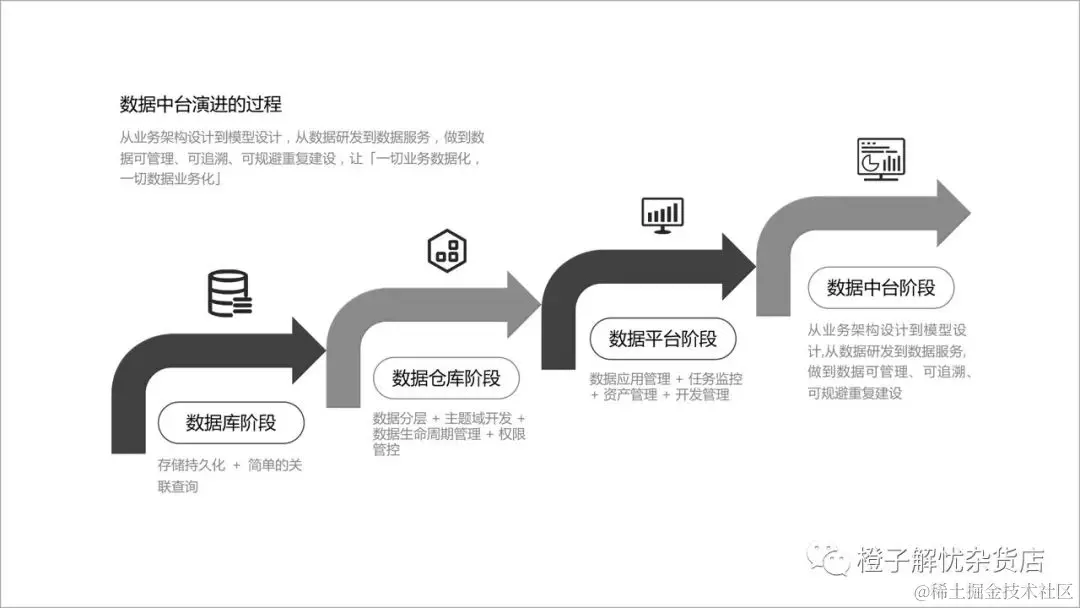 从数据处理的维度来聊一聊数据中台经历的四个阶段:数据库阶段、数据仓库阶段、数据平台阶段、数据中台阶段。