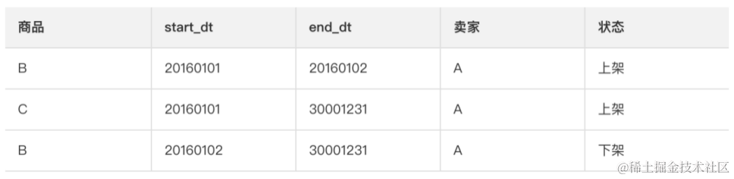 这样,下游应用可以通过限制时间戳字段来获取历史数据。例如,用户访问1月1日数据,只需限制start_dt<=20160101并且 end_dt>20160101。