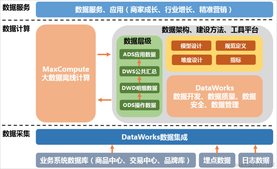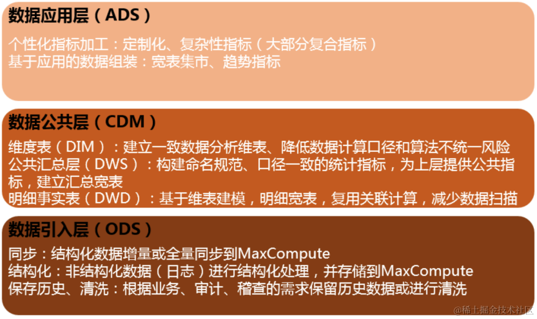 在阿里巴巴的数据体系中,我们建议将数据仓库分为三层,自下而上为:数据引入层(ODS,Operation Data Store)、数据公共层(CDM,Common Data Model)和数据应用层(ADS,Application Data Service)。