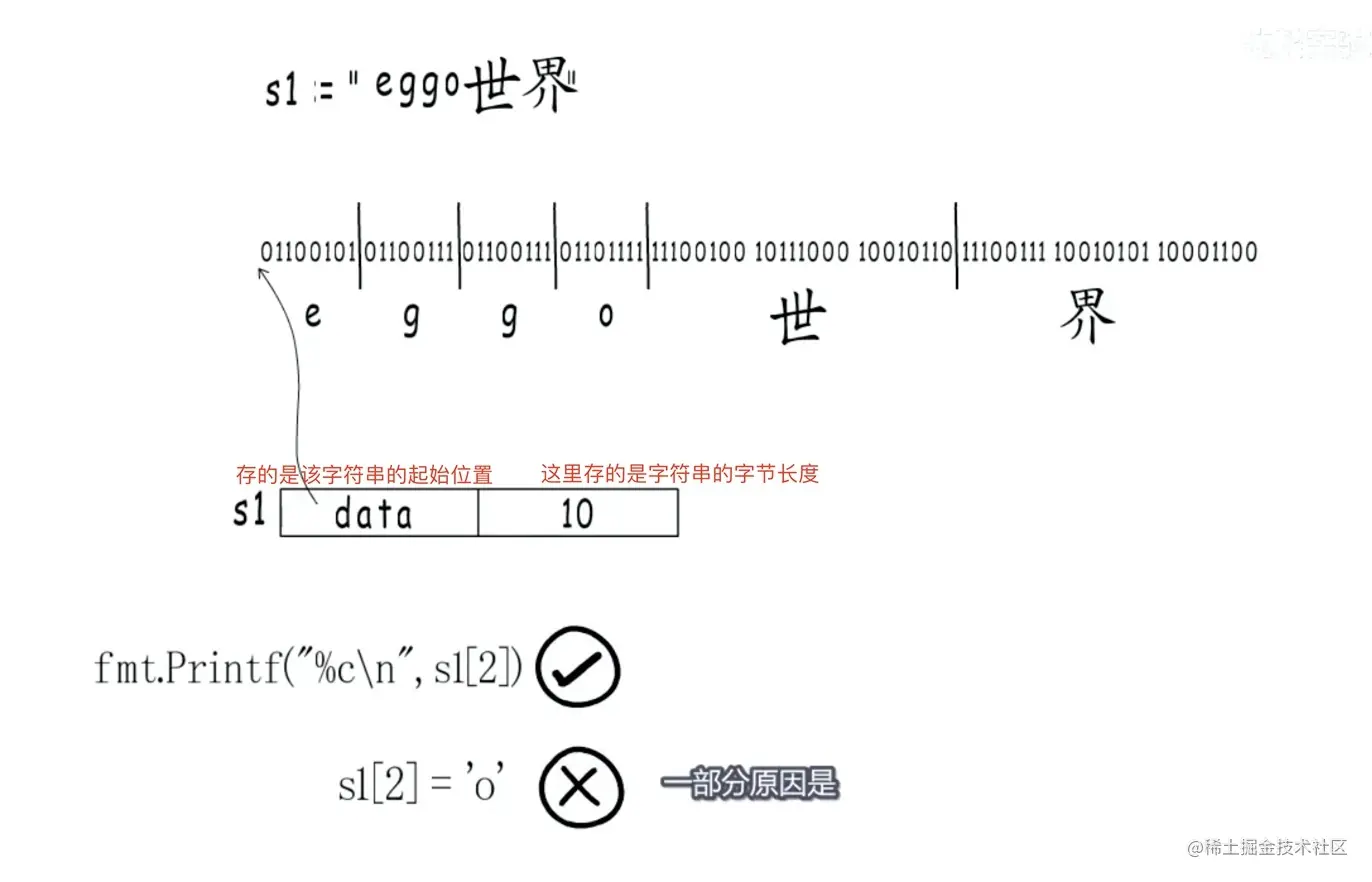 fmt.Printf("%c\n", sl[2]) 可以读取字符串的内容