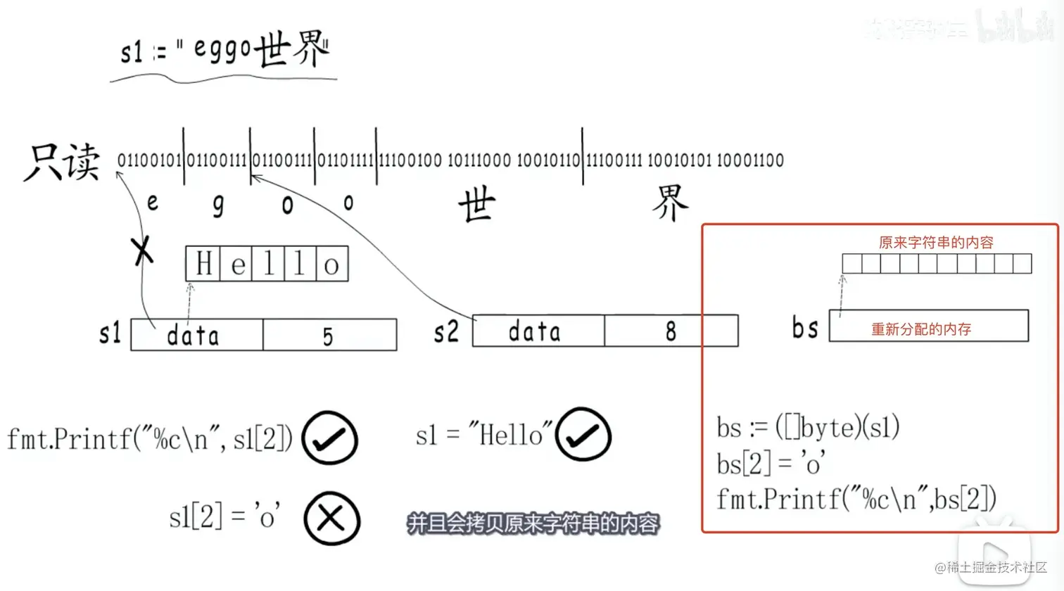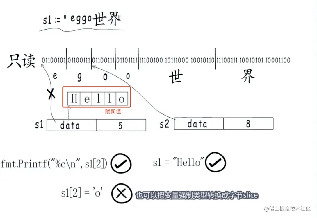 也可以把变量强制类型转换成字节 slice,这样会为 slice 变量重新分配一段内存,并且会拷贝原来字符串的内容,同样可以脱离只读内存的限制。