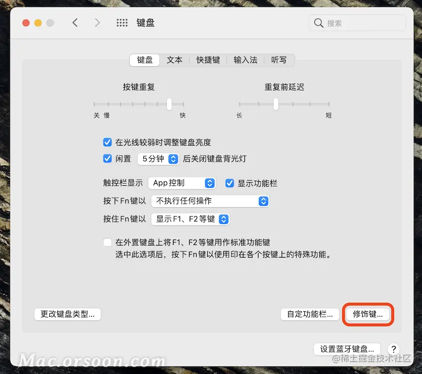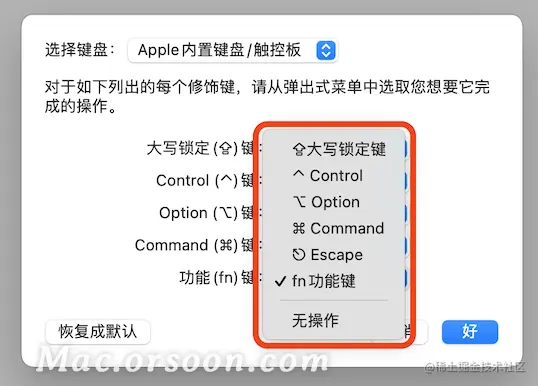 这里还有一个小技巧,Mac 键盘的左下角按键的 fn可以改为【无操作】,这样可以避免在使用 Mac 键盘时的误操作。