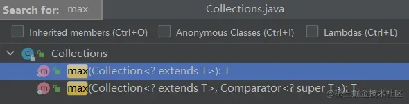 我们以 max 方法为例来说明一下,max 提供了两种类型的方法,一个需要传外部排序器,一个不需要传排序器,但需要集合中的元素强制实现 Comparable 接口,后者的泛型定义很有意思,我们来看下(从右往左看)