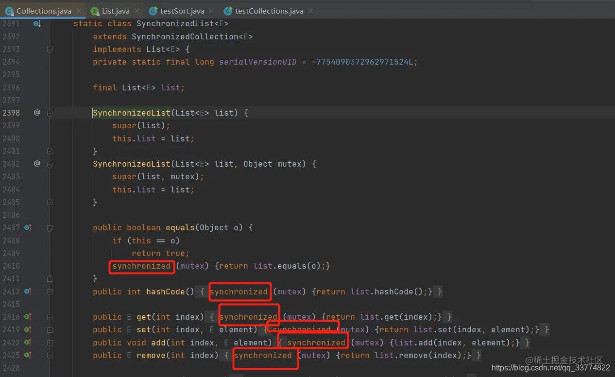 我们以 synchronizedList 为例来说下底层的实现:可以看到 List 的所有操作方法都被加上了 synchronized 锁,所以多线程对集合同时进行操作,是线程安全的。