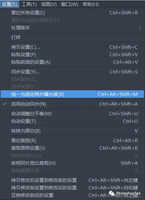 Lr菜单:设置/统一为选定照片曝光度 Match Total Exposures。