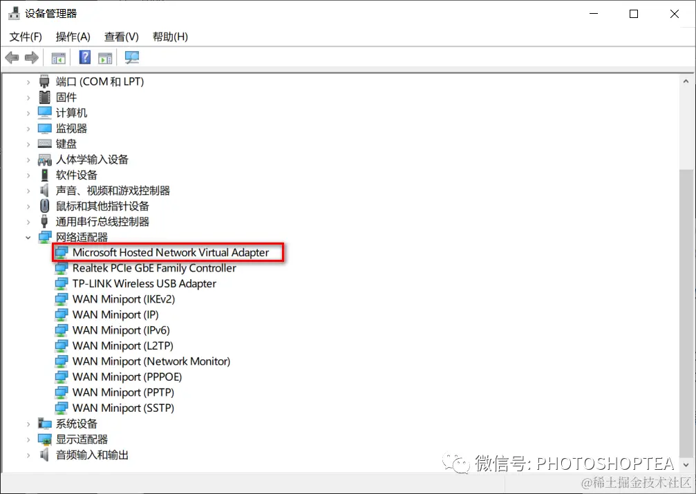 5、右键点击“开始”按钮,选择“设备管理器”,确认“网络适配器”下是否多出一个虚拟网卡:Microsoft Hosted Network Virtual Adapter。
