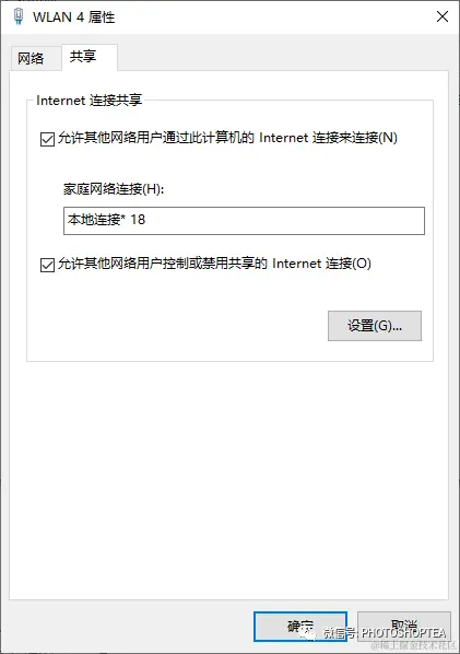 7、在已连接 Internet 的无线网络图标上右击,选择“属性”,点击“共享”选项卡,勾选“Internet 连接共享”相关的选项,如下图所示。