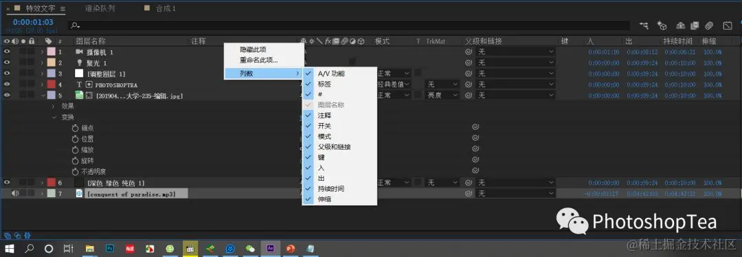 图层控制区域由以下十三项组成,在列标题栏上右击选择“列数” Columns,即可选择隐藏或显示哪一列。