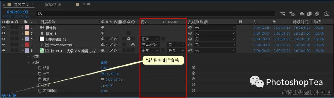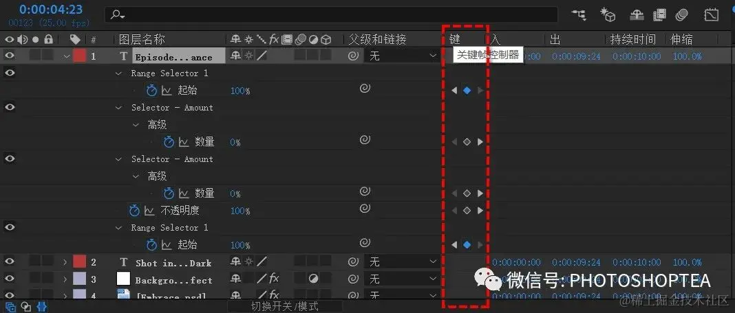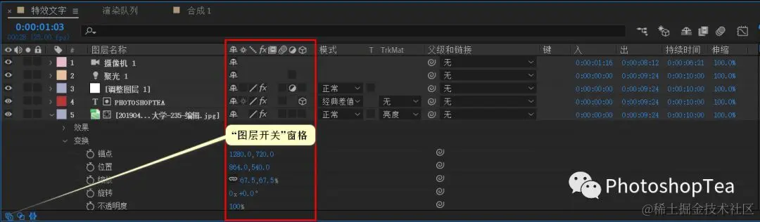 图层控制区域包括了三个主要窗格区:“图层开关”窗格、“转换控制”窗格、“入点/出点/持续时间/伸缩”窗格,可由左下角三个按钮来决定显示或隐藏。