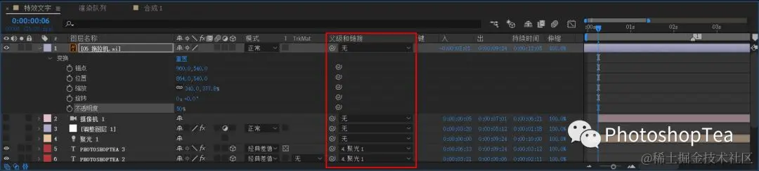 用于指定父级图层。父级图层所做的所有变换将自动应用到子级图层的对应属性上,不透明度除外。\