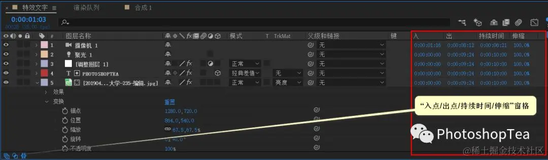 视频图层的持续时间则影响入点、出点的剪切或整体的伸缩,反之亦然。\