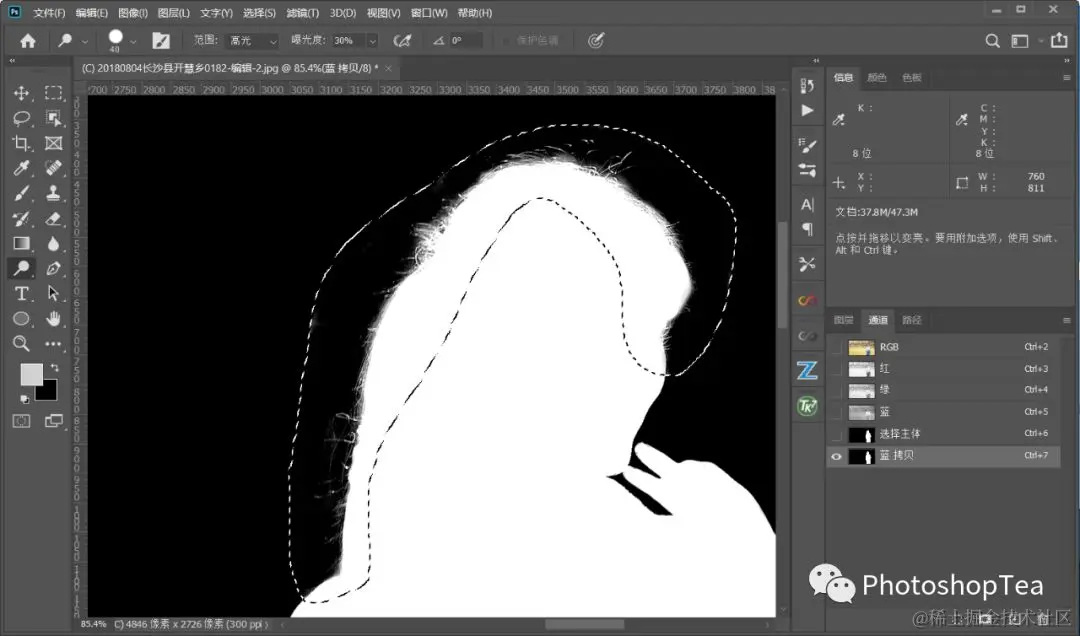 首先快速选中主体,收缩选区,再结合反差最大的通道,使用加深工具和减淡工具处理边缘,从而消除选区边缘的锯齿现象。