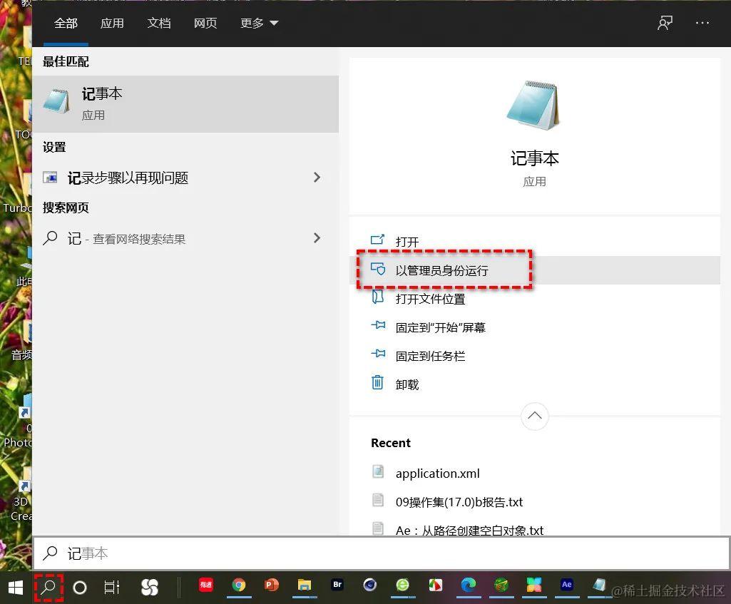 2、搜索“记事本”,并点击“以管理员身份运行”。