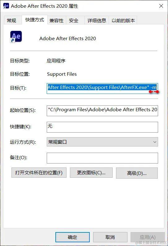 1、在 Windows 桌面上的 Adobe After Effects 快捷方式图标上右击,选择“属性”。在“快捷方式”选项卡下的“目标”栏中,在其最后键入一个空格符和 -m,如下图所示。