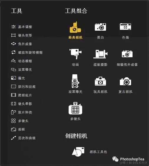 可呈现多种经典相机、胶卷或镜头的风格和感觉,就像配备了多台传统相机一样。相机工具包中提供了基本调整双重曝光、胶片种类、多镜头、相框、等多个工具用于调整和组合。已经提供了的组合(即预设)有:经典相机(9个)、黑白(9个)、色偏(4个)、动画(即动感模糊,9个)、湿板摄影(9个)、细微焦外成像(4个)、双重曝光(9个)、玩具相机(9个)、复古相机(9个)、多镜头(9个)等,每个组合里还为有选择困难症的人提供了一个随机选取的按钮。