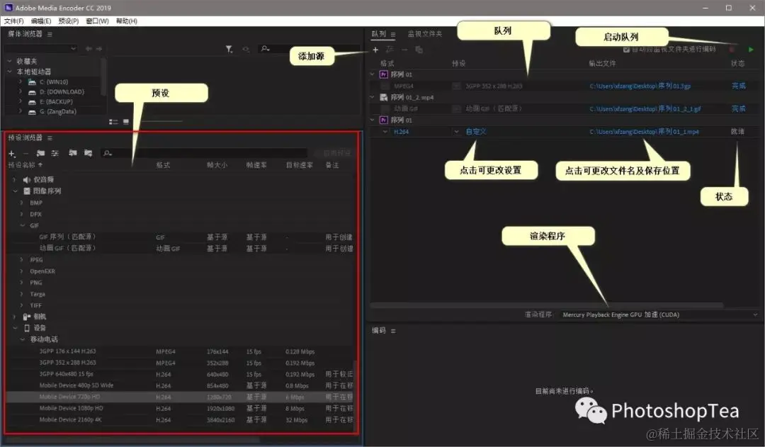 1、可以将不同预设拖到队列上的源名称上,以创建不同版本的输出。