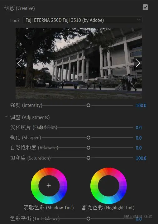 调整应用的 Look 的强度。