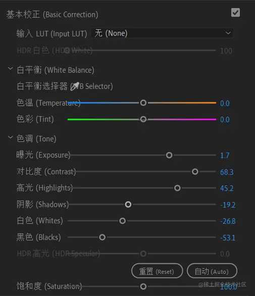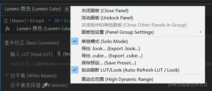 2、要使用“基本校正”模块中的“HDR 白色”与“HDR 高光”选项,需在 Lumetri 颜色面板控制菜单中开启“高动态范围”。