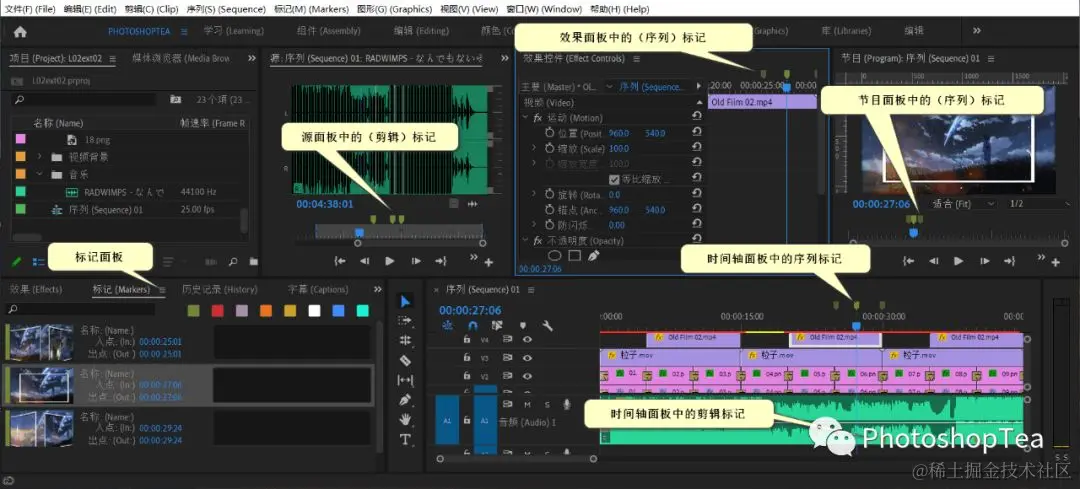 在 Pr 中有两种类型的标记:剪辑标记与序列标记。