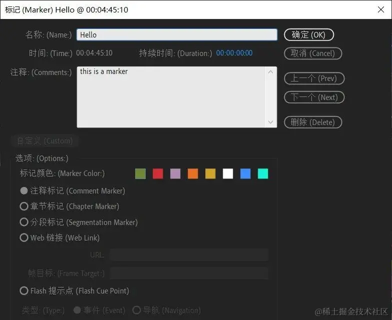 双击标记,进入标记对话框,可以进行命名、注释、拆分(持续时间)、定位、选择颜色及类型等操作。