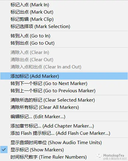 还可在各个面板的时间标尺上,通过右键菜单添加标记。