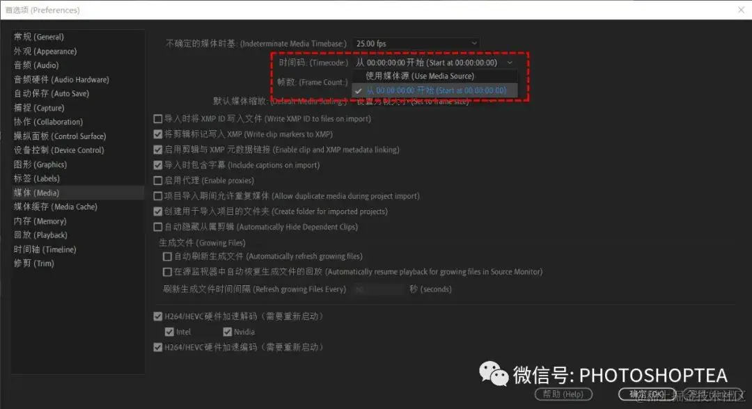 提示:如果想要源面板上所有素材的时间码都从“00:00:00:00”开始,应进入“首选项/媒体/时间码”中设置。