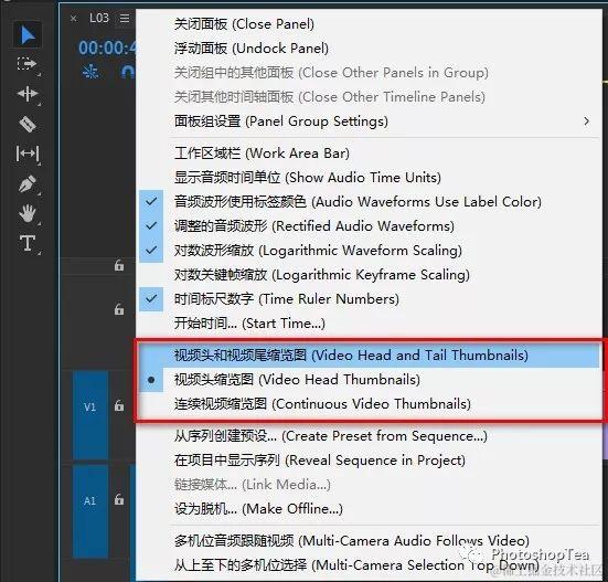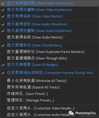 打开时间轴面板控制菜单,可进行更改剪辑缩览图样式等操作。
