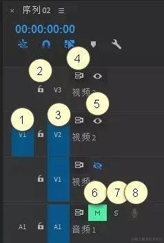 V1、V2、V3 等表示视频轨道,A1、A2、A3 等表示音频轨道。应将视频或音频剪辑拖入到相应类型的轨道。
