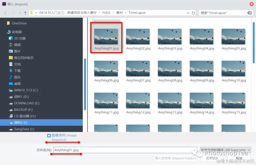 导入素材时,进入图像文件夹后,选中第一张,然后勾选“图像序列”,点击打开。