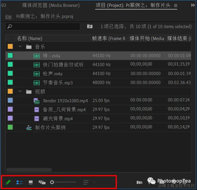注意观察一下那些导入到项目面板里的素材的图标显示。比如,视频、音频、图片的图标以及无音频的视频等等。