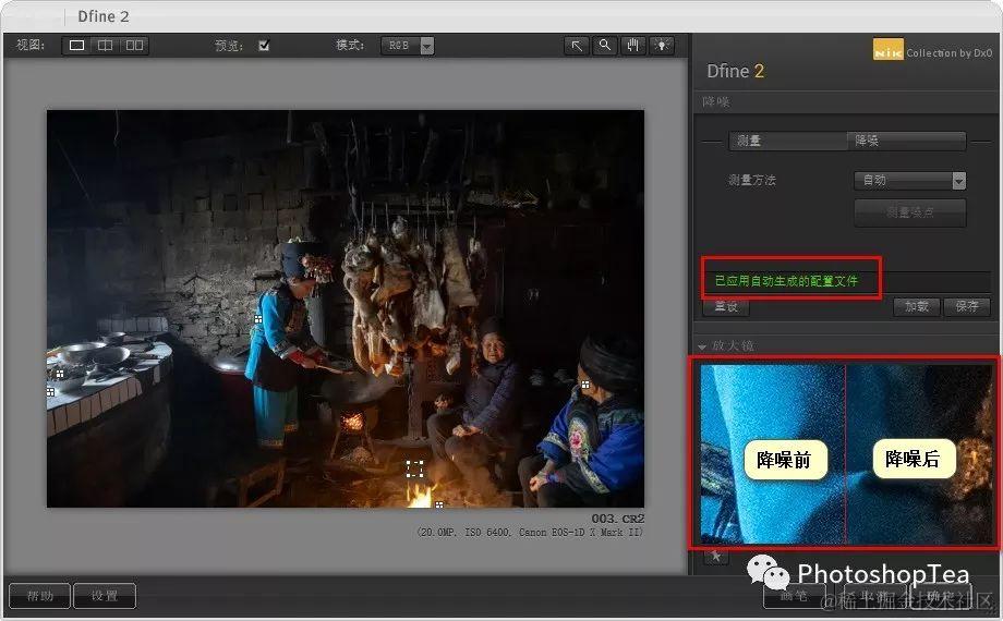 打开 Dfine 2,它会自动对图片进行取样、分析、计算。稍等一会儿,进度条显示绿色文字 “已应用自动生成的配置文件”,表示自动降噪已经完成。