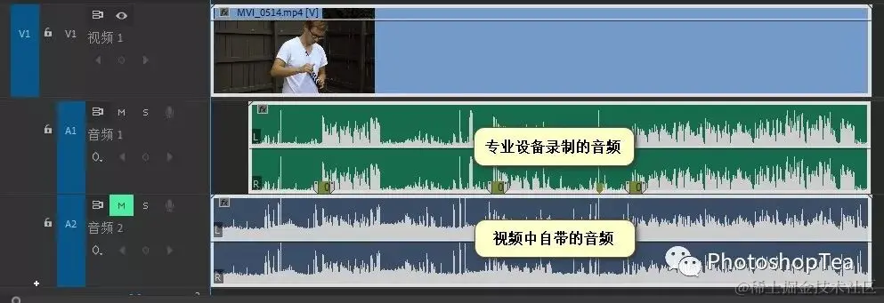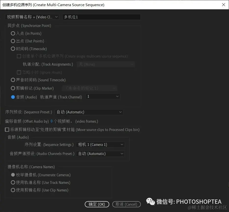 与合并剪辑一样,新建的多机位源序列中同样包含视频中的音频和专业音频。