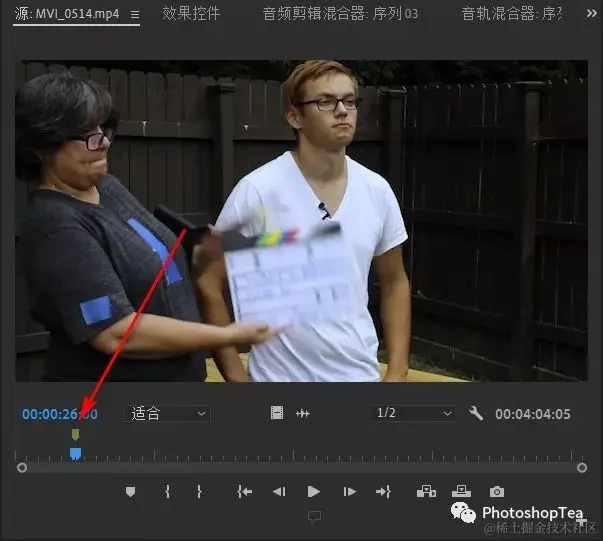 在源面板中打开素材。首先标记(快捷键:M)专业音频素材的位置。