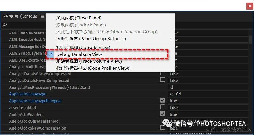 点击控制台面板控制菜单,选择“Debug Database View”.
