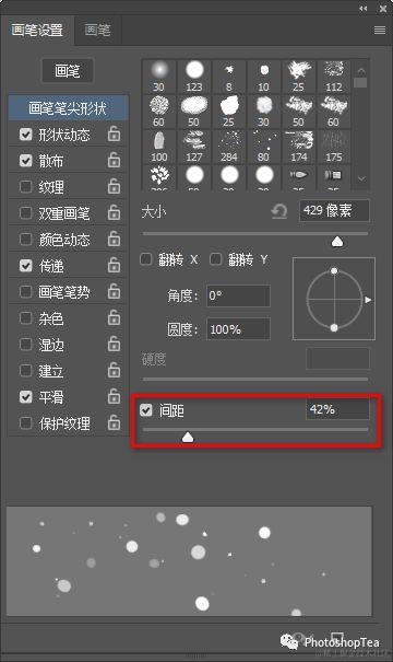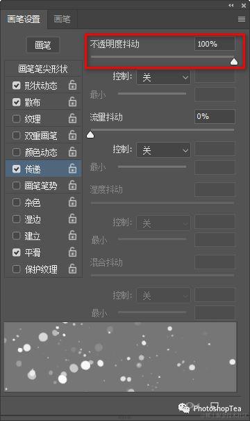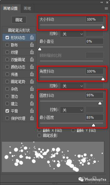 (1)形状动态:如图所示设置大小抖动、角度抖动、圆度抖动等。