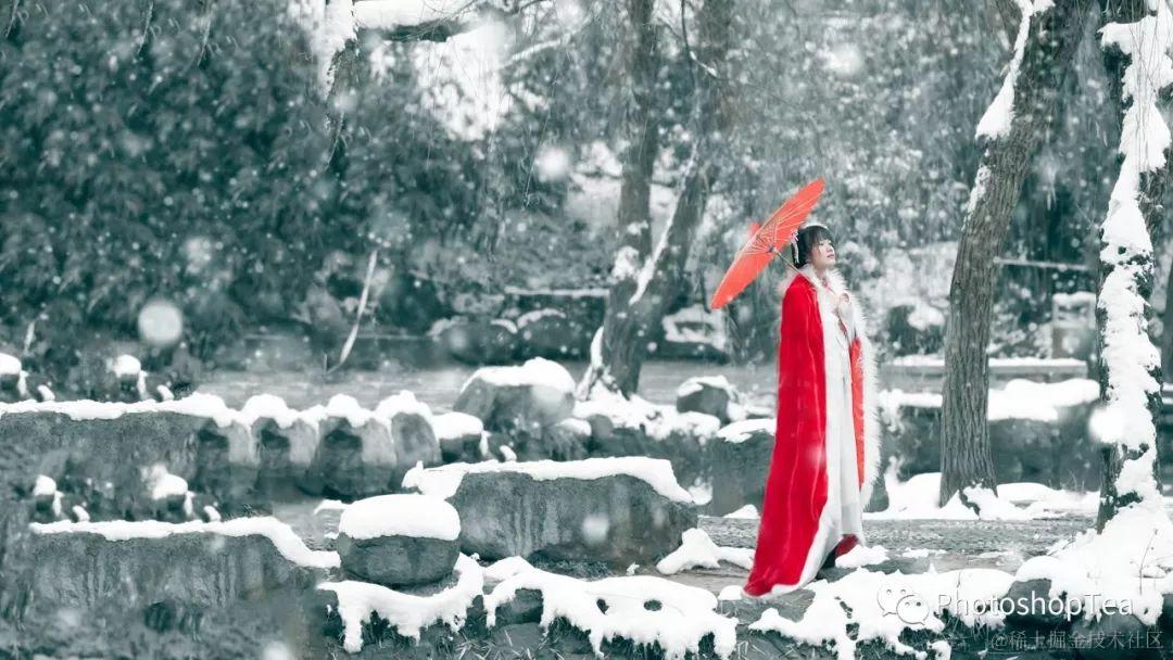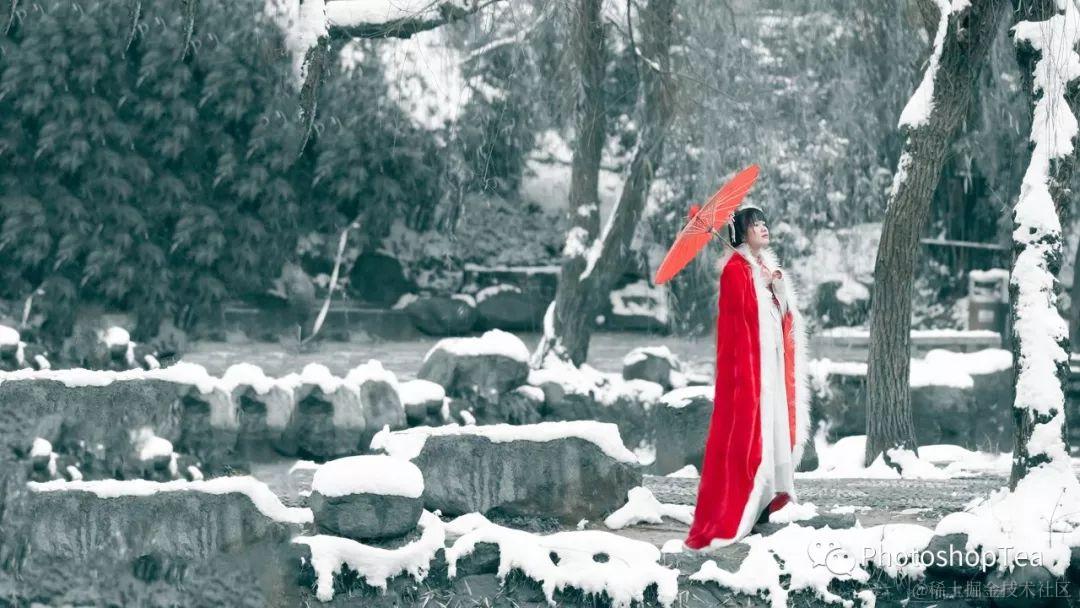 用雪花素材进行叠加。通常只要将图层混合模式改为滤色即可,简单高效。