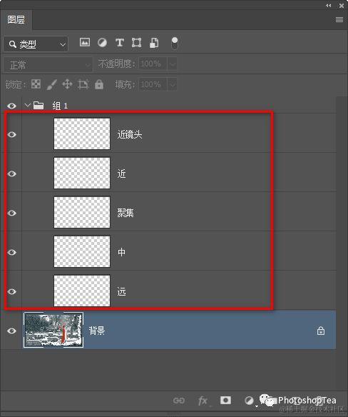 打开要添加飘雪效果的照片,新建几个空白图层,可分别命名为:近、中、远、聚焦、近镜头等,然后用不同大小的飘雪画笔(白色)在不同空白图层上绘制雪花。