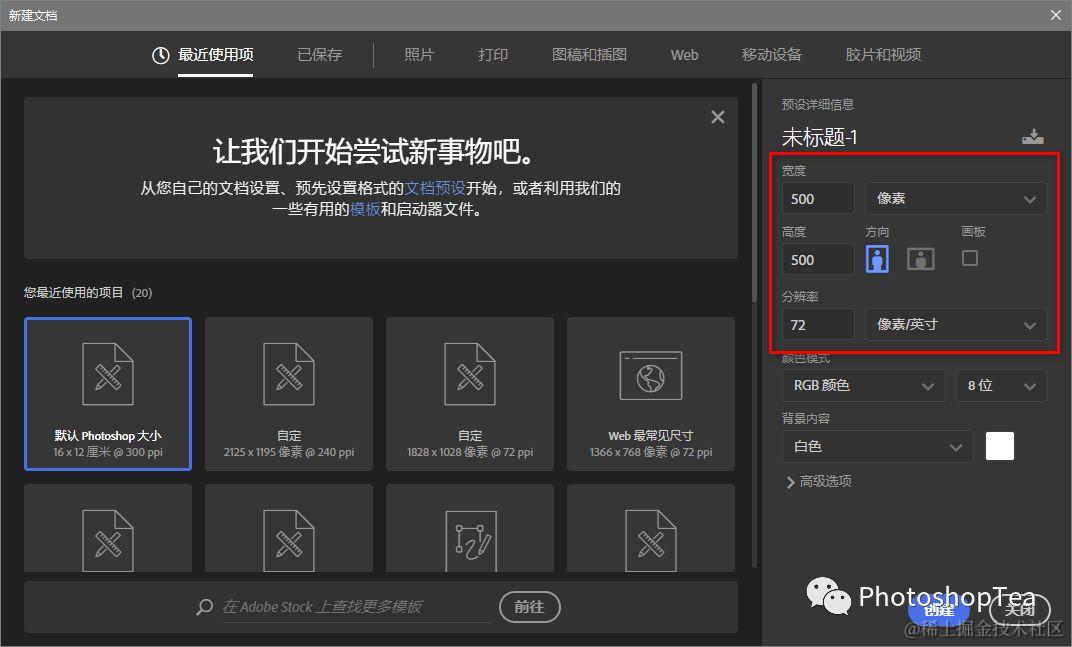 1、新建文档,500 x 500 像素,72 像素/英寸,白色背景。