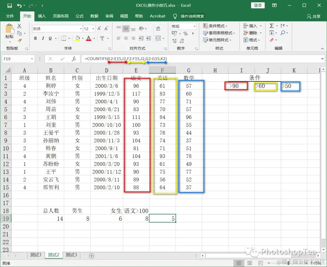 例 1,统计语文成绩大于 90、英语成绩大于 60、数学成绩大于 50 的人数。